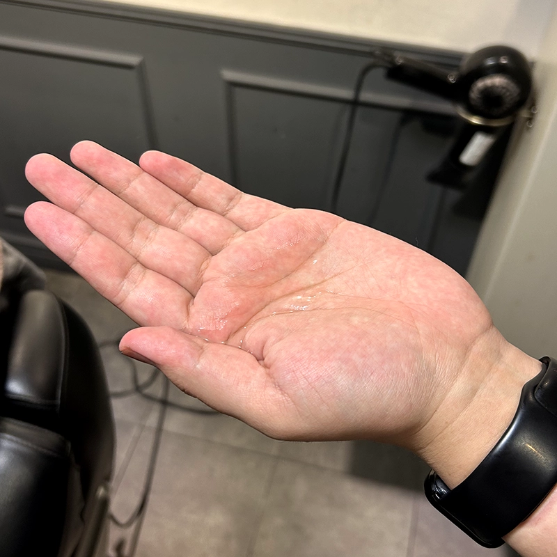 ドライヤーでベースをつくったら、次は整髪料をつけます。しかし、その前にどんな整髪料を用意していくかも重要です。というのも、縮毛矯正した髪はとても繊細で乾燥しやすいため、これまで使ってきた整髪料だと適さないケースがよくあるからです。
