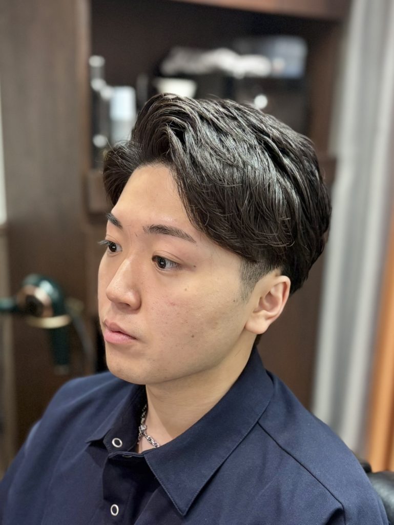 サイドはタイトに刈り上げ、トップは長さを残して自然な毛流れを演出。