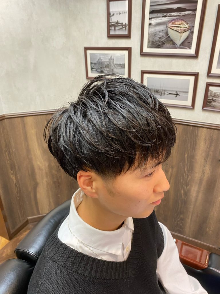 サイドはツーブロック、襟足はすっきり刈り上げることで、マッシュ特有の重さを残しつつも清潔感のあるシルエットに仕上げています。
